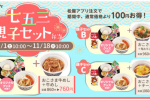 松屋は2025年11月1日10時〜18日10時の期間、アプリにてテイクアウト限定「七五三親子セット」を販売します。 「七五三親子セット」では、「おこさま牛めしわくわくセット」と「牛めし」・「鬼おろしポン酢牛めし」・「チー…